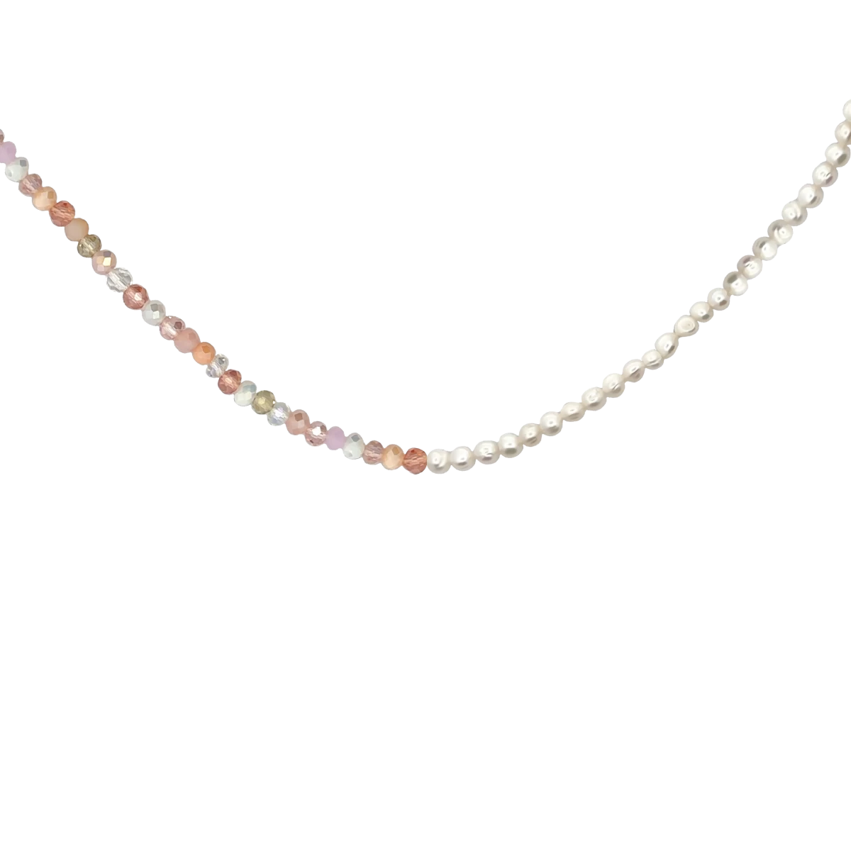 Egy lenyűgöző nyaklánc, amely a presztízs és a modern divat elegyedése, ahol a gyöngyök finomságát és a rózsaszín-fehér kristályok fényének játékát egy rendkívül különleges 18 karátos sárgaarannyal bevont 925 finomságú ezüst karabiner emeli a csúcsra.