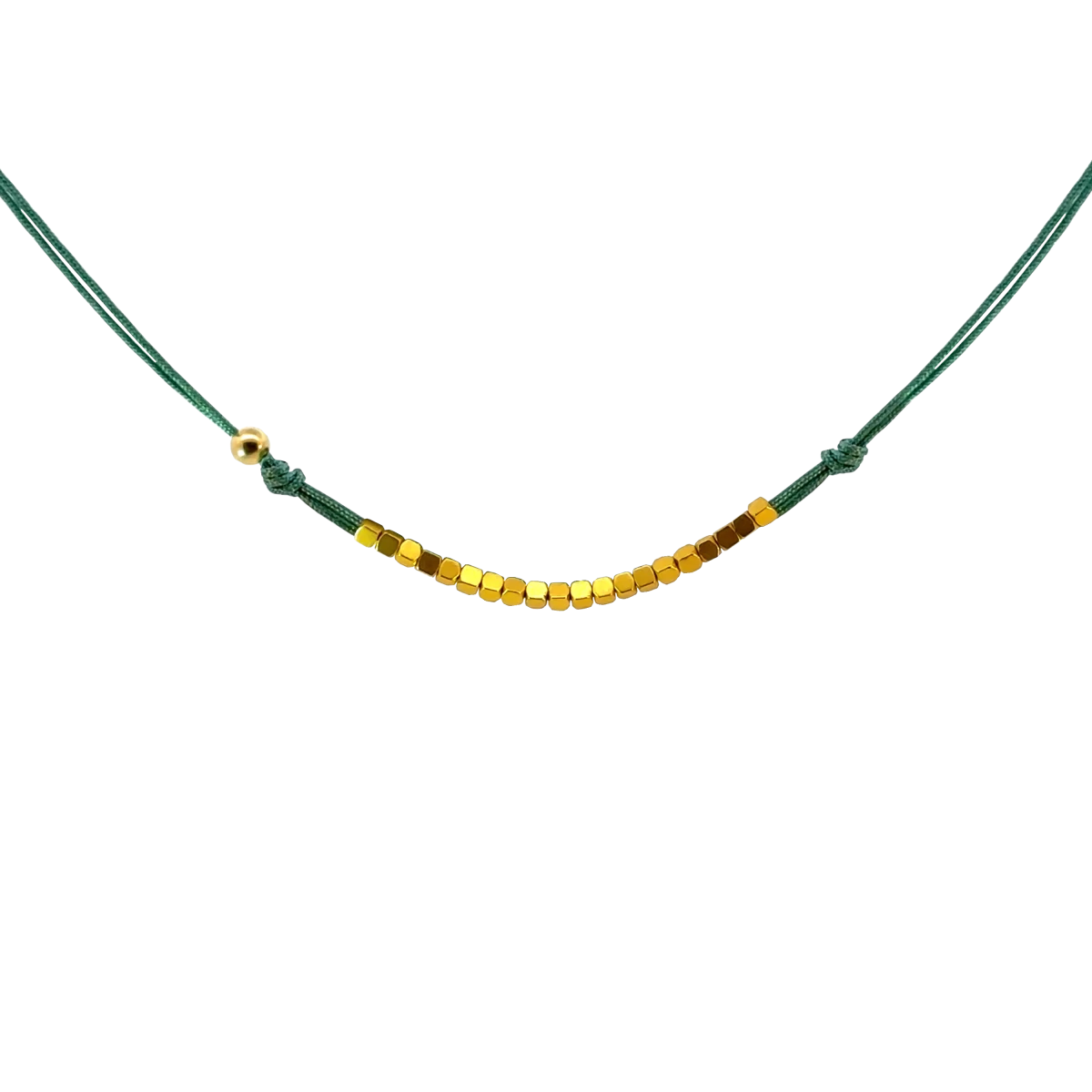 Dobd fel a hétköznapokat ezzel a zöld fonalas nyaklánccal, amelyet elegáns arany színű hematit kockák díszítenek! Az állítható lánchosszabbító biztosítja, hogy a nyaklánc kényelmesen illeszkedjen. A zöld fonat és a fényes arany hematit harmonikus kombinációja egyedi, figyelemfelkeltő megjelenést kölcsönöz.