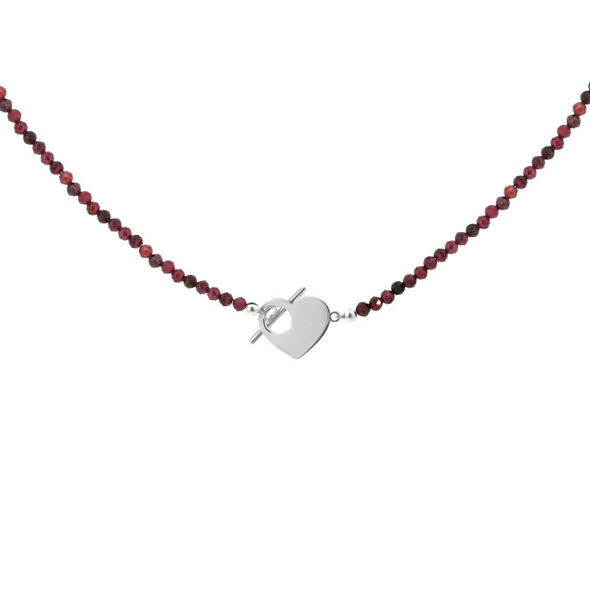 Ez a nyaklánc elegáns vöröses-bordós árnyalatú gránátokkal és különleges, szív formájú zárral a stílus és az érzelmi kifejezés tökéletes kombinációja. A gránát mélyvörös árnyalatai energiát, vitalitást és magabiztosságot sugároznak, miközben a természetes formák minden darabot egyedivé tesznek. A szív zárral a nyaklánc a szeretet, az összetartozás és a mély érzelmi kötelék szimbólumaként is szolgál. Tökéletes választás azoknak, akik harmonikus, elegáns és jelentéssel bíró ékszert keresnek.